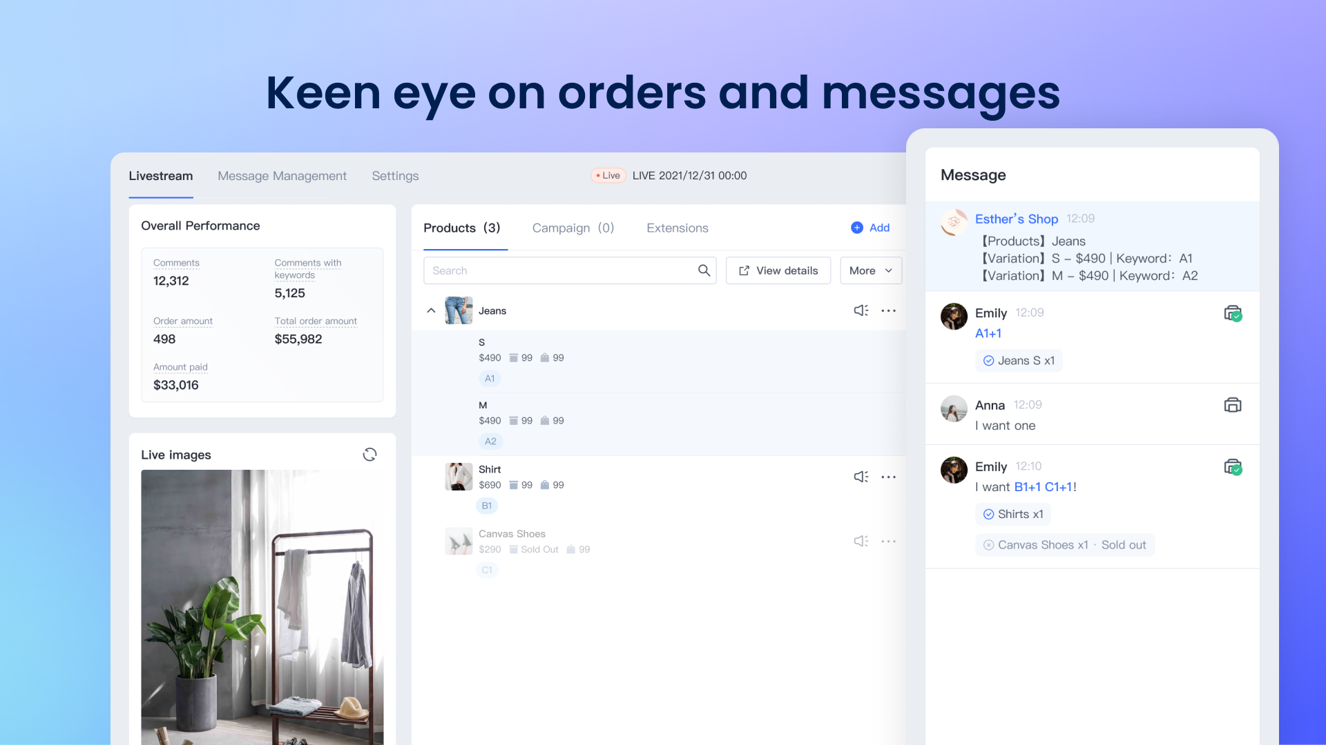 Interact with customers' messages in livestreams and generate precise purchase orders by extracting keywords and quantities