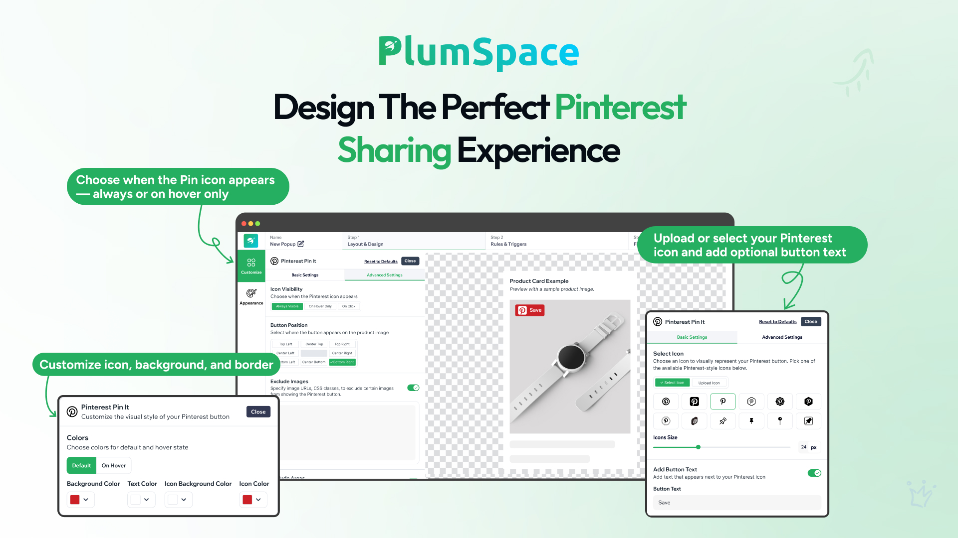 Upload your own icon, adjust its size, and add optional button text for clarity.
