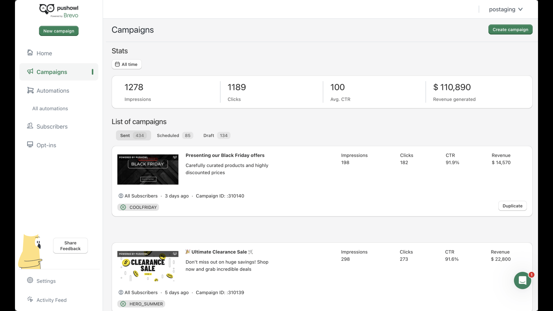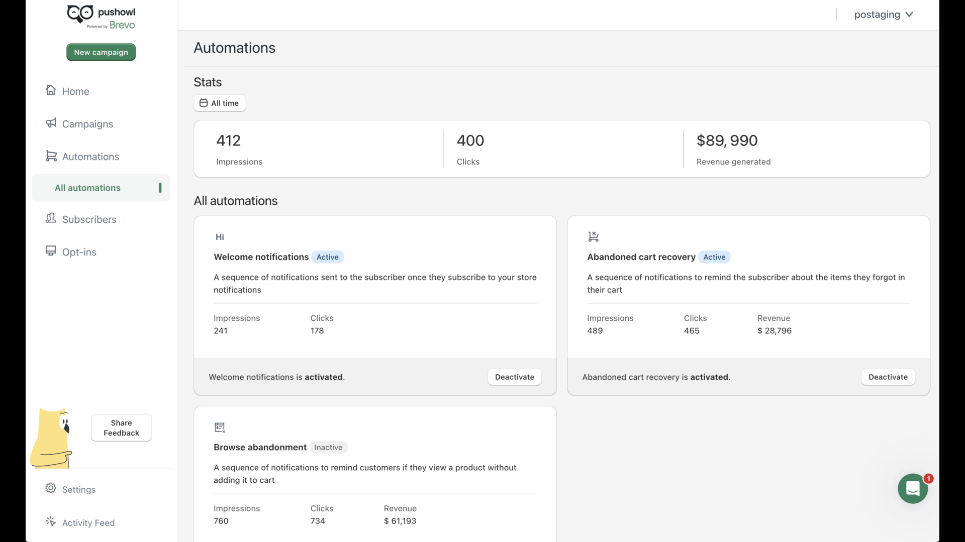 PushOwl is a web push notifications and abandoned cart recovery marketing suite. It packs powerful automation pre-sets, including smart email pop-ups, newsletters, abandoned cart recovery, checkout alerts, back-in-stock reminders, flash sale campaigns, price drop alerts, and much more! With infinite list size, powerful segmentation and automation tools, and world-class support, it is a powerhouse for improving sales, retention, and revenue!