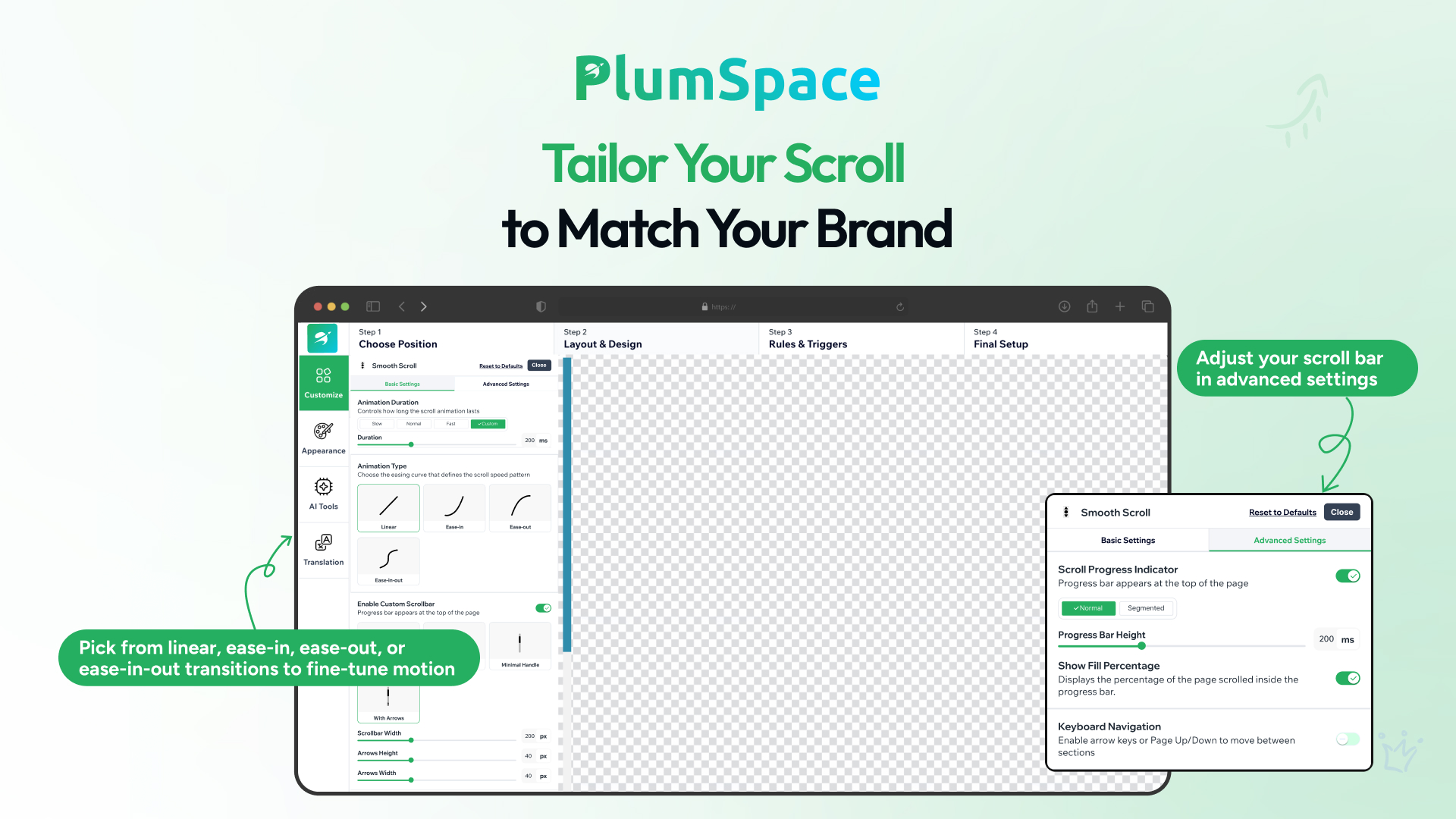 Transform how visitors move through your store with Smooth Scroll. This app brings elegant, buttery-smooth scrolling to your pages — enhancing user experience and creating a more professional, high-end impression. With complete control over animation duration, scroll style, and custom scrollbar designs, Smooth Scroll lets you fine-tune every detail to match your brand. Add progress indicators, enable keyboard navigation, and make your store feel fast, fluid, and intuitive on every device.