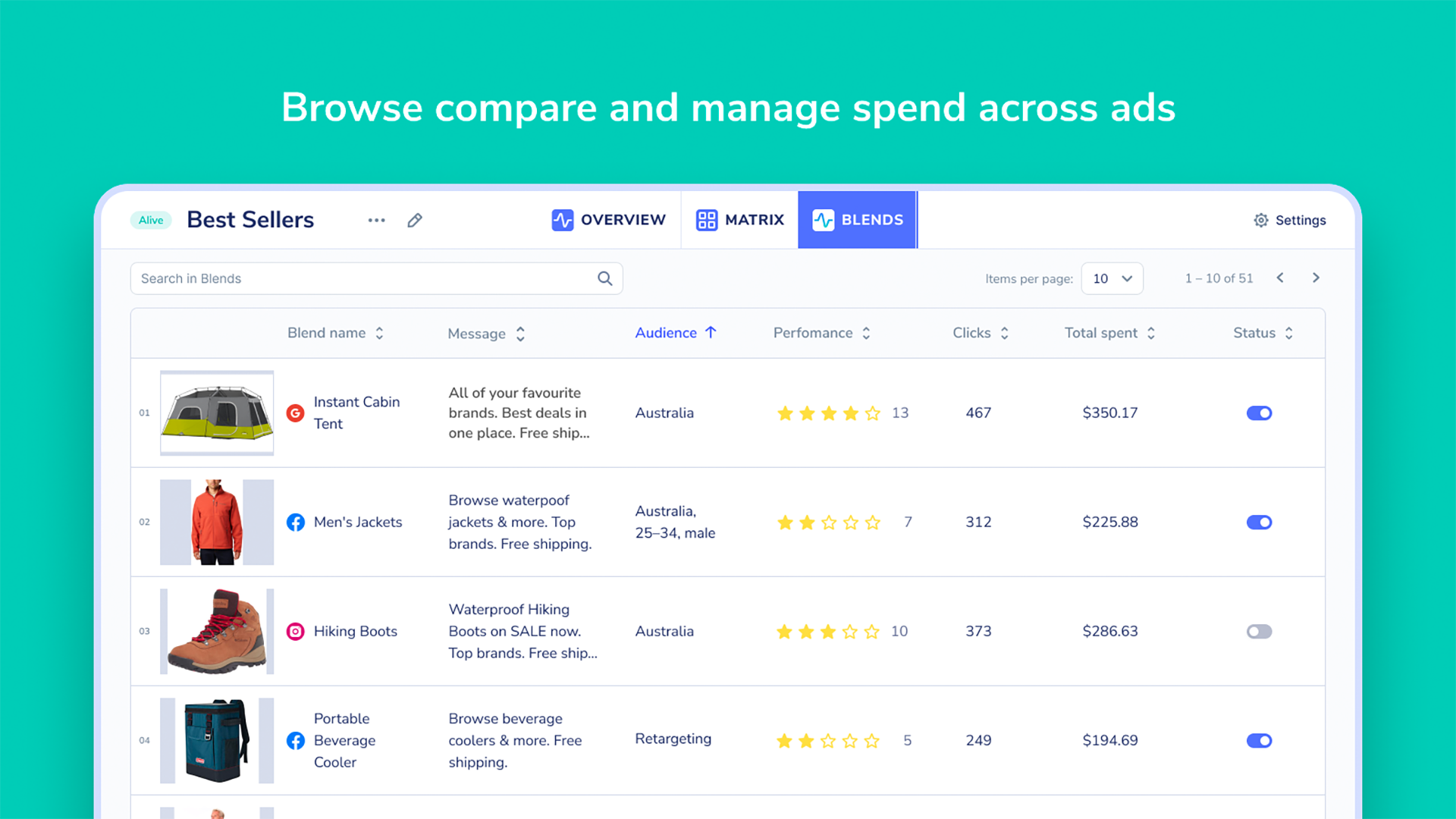 Blend automates your sales funnel and automatically allocates budget to create a balanced, high performing monetization funnel.