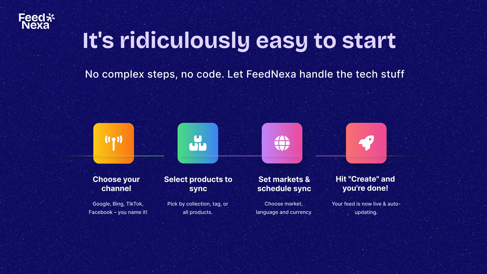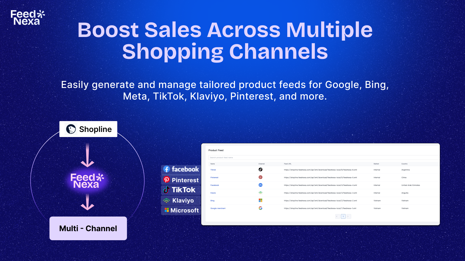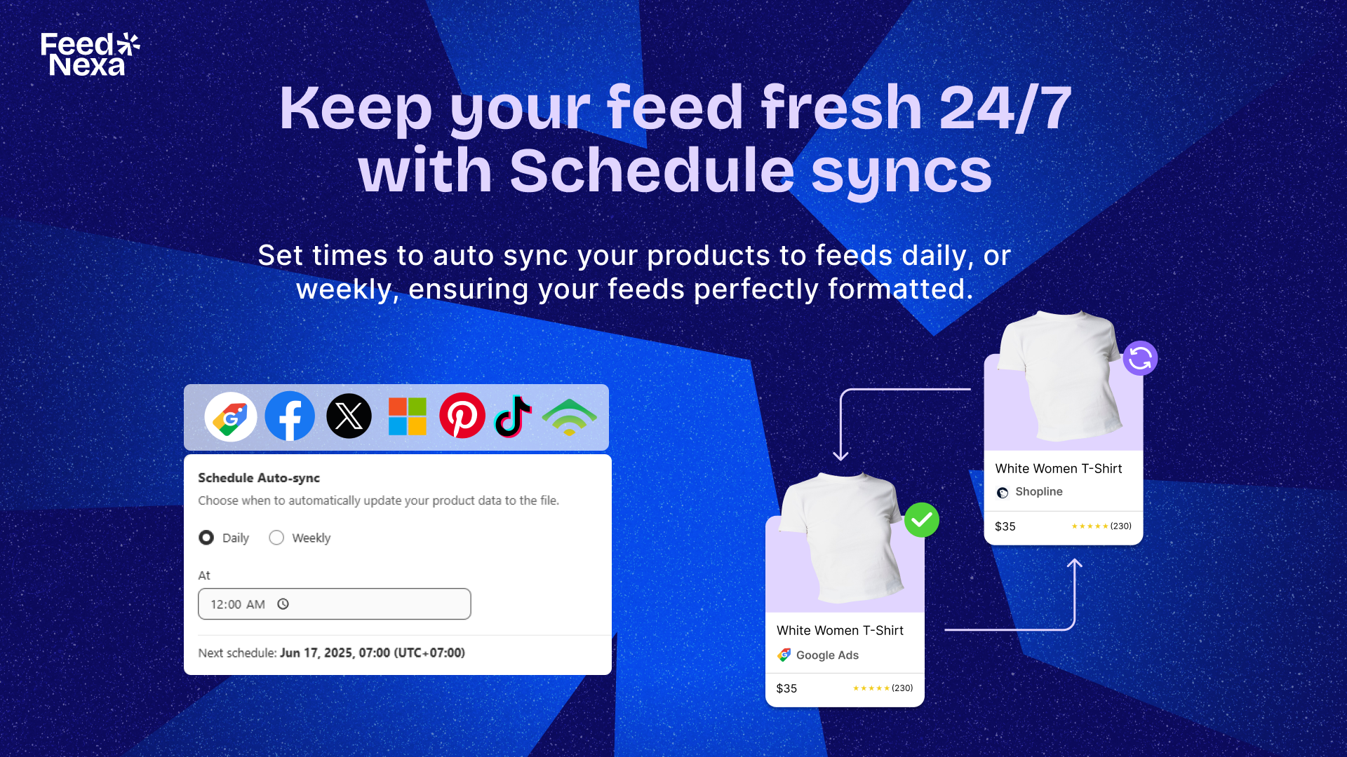 Advertising across multiple shopping channels can be a game‑changer: studies show that Shopping ads powered by optimized product feeds convert 30% more often and deliver 20% lower cost‑per‑acquisition than standard text ads. Yet creating and maintaining those feeds manually is time‑consuming, error‑prone, and often requires technical know‑how, especially when you need different feeds for Google, Facebook, TikTok, Bing, Pinterest, and more. FeedNexa Multiple Feed Sync removes these barriers by automating every step of the feed workflow: - Unified Feed Management: No more juggling spreadsheets or disparate tools for each channel. Generate, preview, and manage all your XML feeds from one simple dashboard. - Error Reduction & Consistency: Automatically format feeds to each platform’s specifications and minimize the risk of disapprovals, so you can focus on optimizing campaigns, not fixing errors. - Time Savings & Scalability: What once took days of manual work now runs on a schedule you set (daily or weekly), freeing your team to test new products and markets faster. Whether you’re a small seller struggling with feed setup or an enterprise brand scaling Shopping Ads across regions, FeedNexa ensures your product data is accurate, up‑to‑date, and ready to drive higher ROAS.