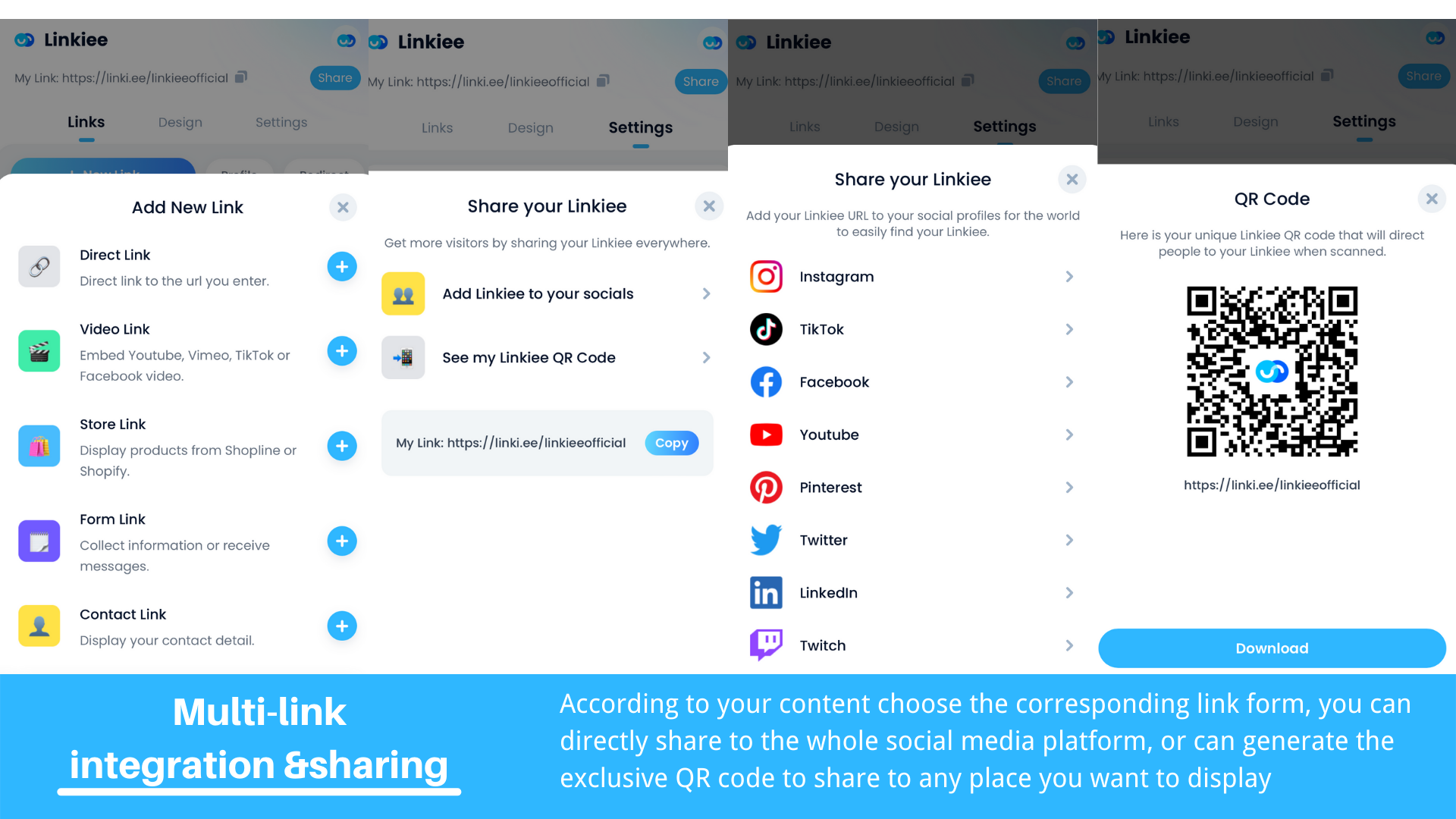 There is no link limitation on your Linkiee page shared on social media platforms, and unique QR codes can be generated for offline promotion and publicity!