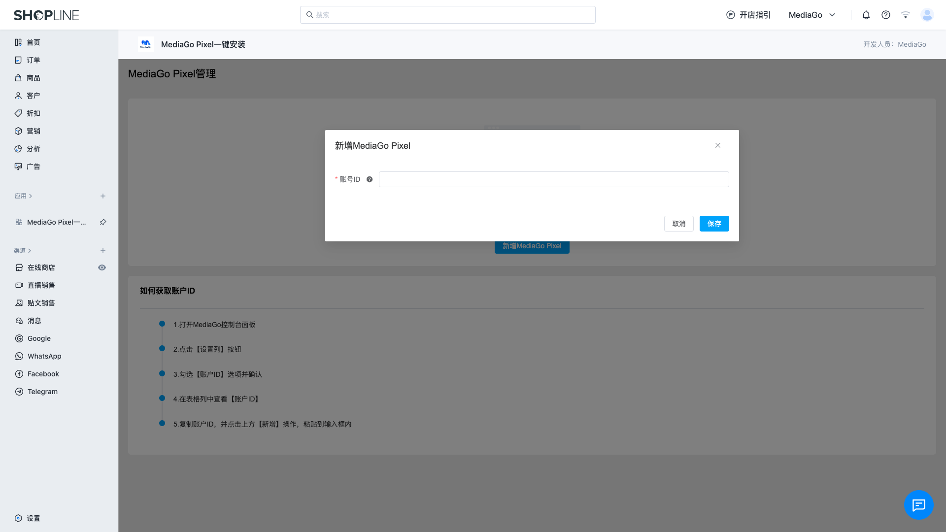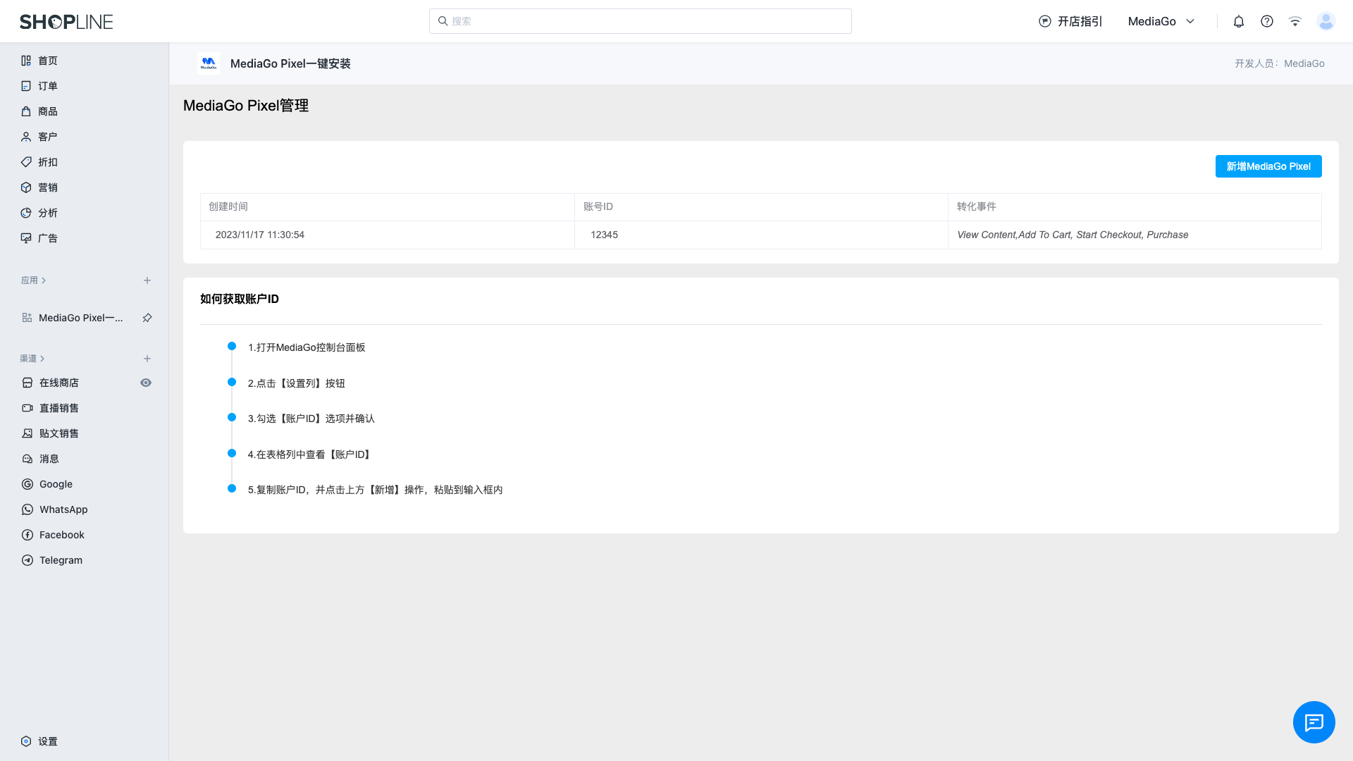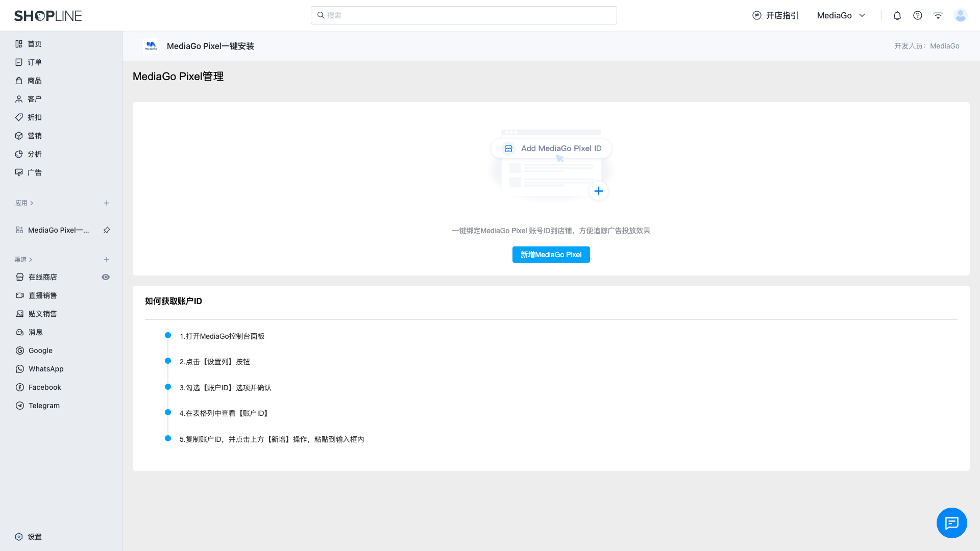 通过绑定MediaGo账户ID,一键安装MediaGo Pixel,方便追踪广告投放效果。