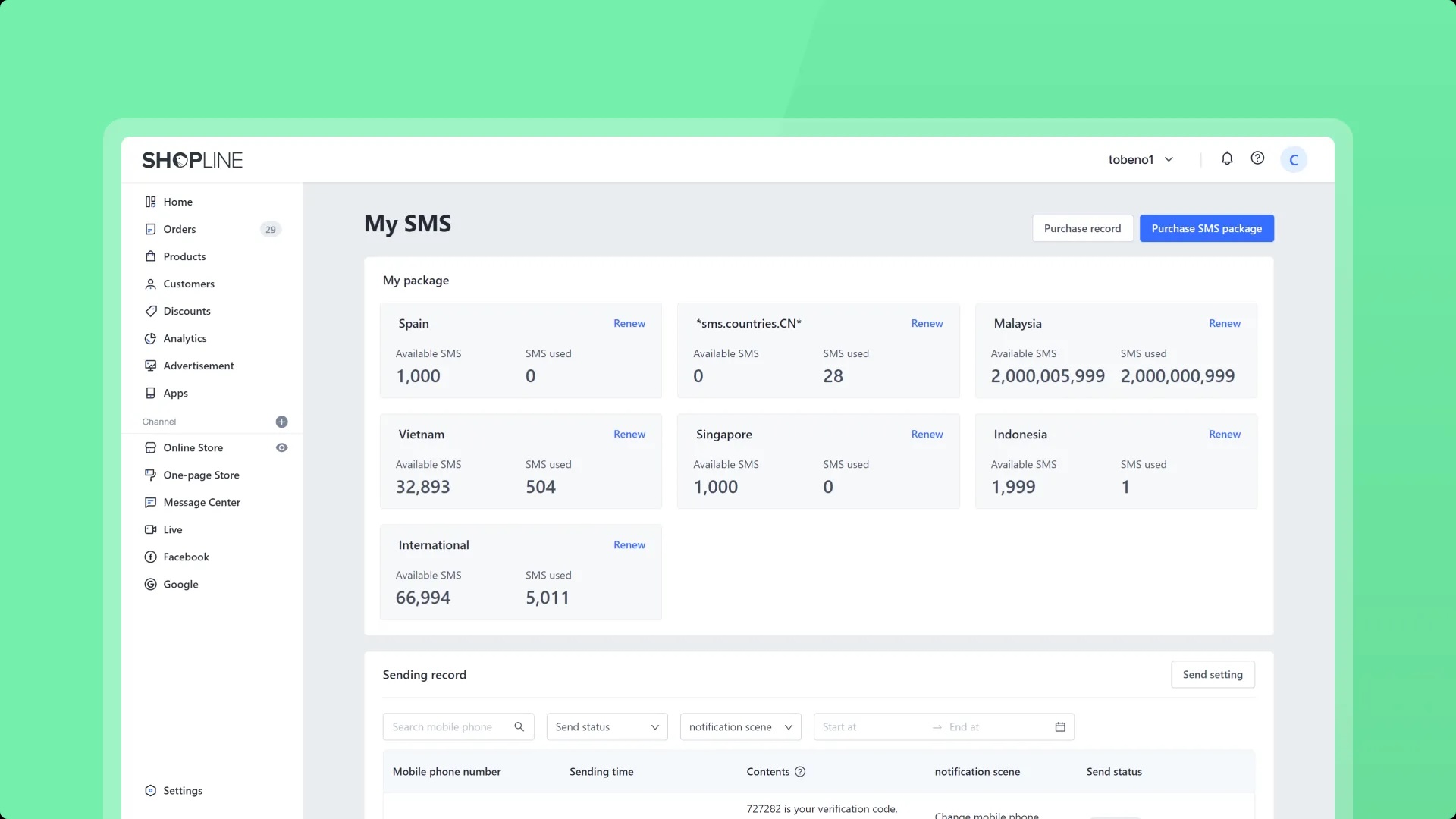 Provide SMS supports, send messages for scenarios like customer registration, order notification, COD