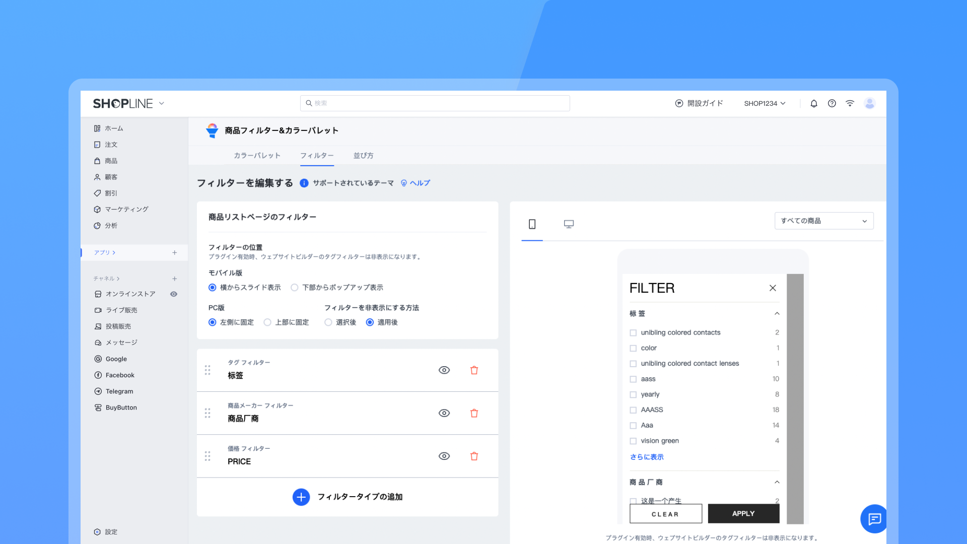 商品フィルタ&カラーチップ