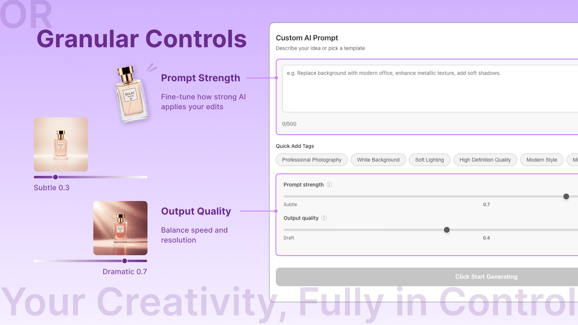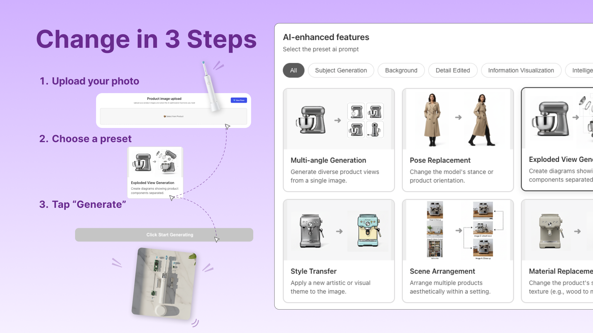 AI-powered product image editor. Generate multiple angles, swap backgrounds, enhance photos instantly. No design skills needed. For e-commerce, marketing, and creators.