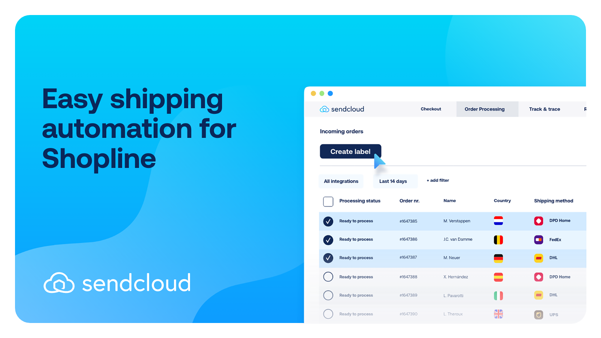 Easy shipping automation to help your business grow. Turn shipping from a bottleneck to an accelerator for growth with Sendcloud, the shipping automation platform. Save up to 7 minutes per parcel shipped and provide your customers with a top-tier delivery experience. Sync your Shopline account to Sendcloud in less than 5 minutes and immediately streamline your order processing in one convenient platform. Connect to a broad range of carriers worldwide, offer top-of-the-line tracking and returns, print shipping labels in just a few clicks, and more.