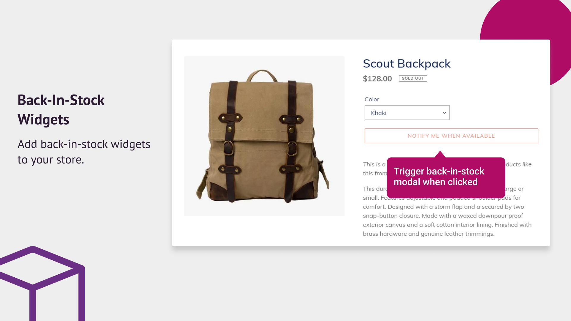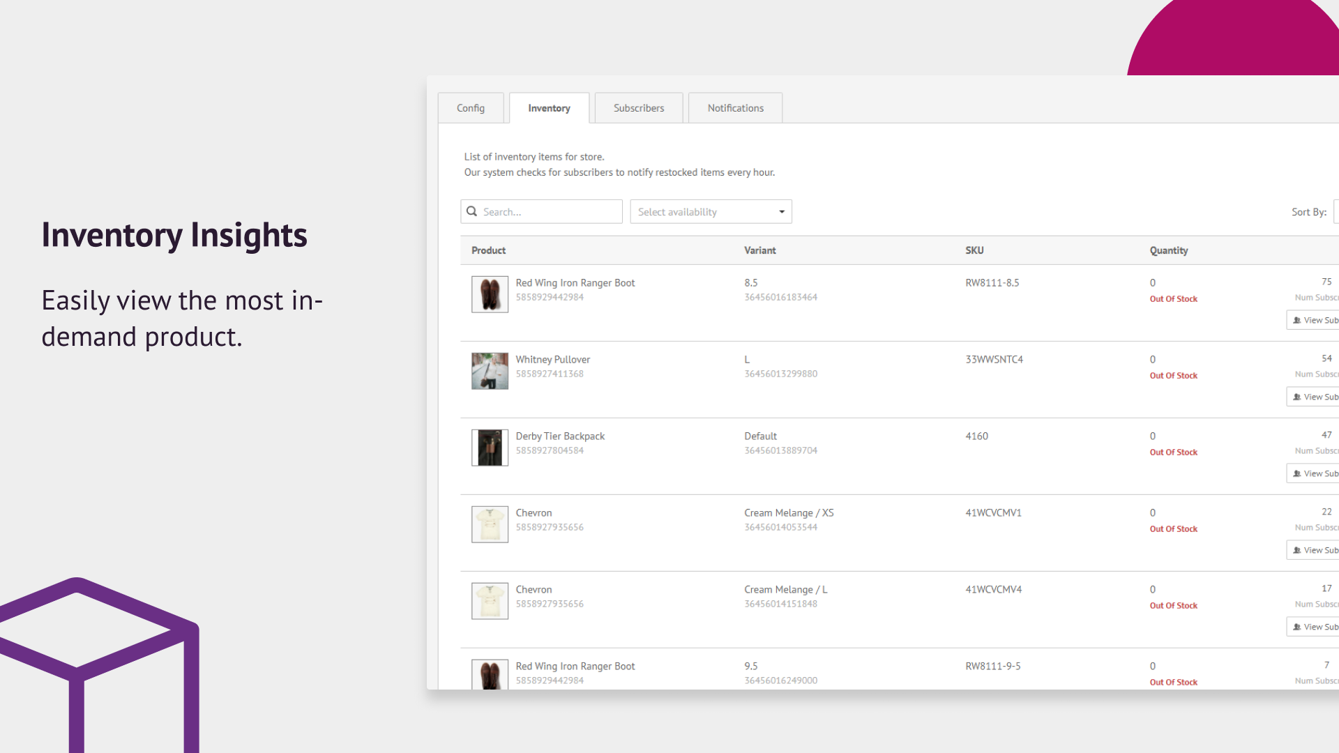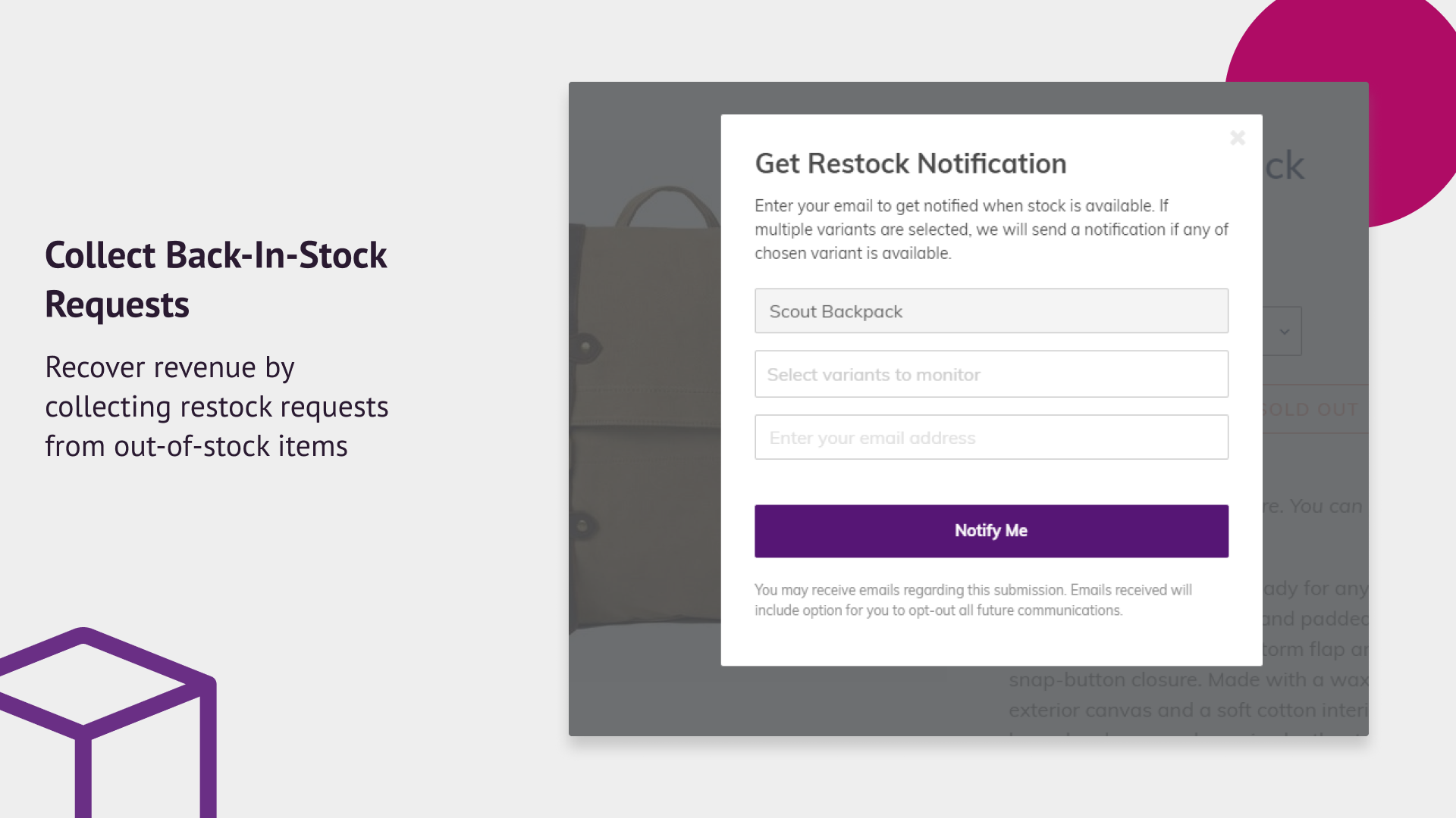 Recover Out Of Stock Revenue A merchant loses revenue every time customers view an out-of-stock item. These revenue can be recovered if you have a way to notify customers when out-of-stock items are replenished. OnVoard's Back-In-Stock tool makes it easy for merchants to allow customers to subscribe for back in stock notifications and automatically notifies them when products are restocked. Gauge Products Demand There's no better way to gauge product demand than letting your customers tell you exactly what they want. Use inventory dashboard to view the most in-demand products that are currently out of stock. Available Triggers - Floating Button - Inline Button - Inline Form - Inline Text See our demo site for live examples. Why choose OnVoard Back In Stock app? 1) Subscribe Multiple Product Variants With OnVoard Back In Stock app, your users can subscribe to multiple product variants within a single form. If you are using other back-in-stock tools, your users will need to submit multiple forms for them to subscribe multiple product variants. For example, if a user wants to subscribe to any of "S/Red, S/Blue and S/Green", they need to submit 3 times when using other back-in-stock tools. 2) Distinctive features that you can't find on other platforms - Allow users to subscribe to multiple product variants within a single submission. - Collect more subscribers by automatically display modal when user views an out-of-stock product. - Autofill email for logged-in users. - Tags whitelist/blacklist to display back-in-stock widgets for certain products. - Display back-in-stock widgets if any of product variant is out-of-stock. Commonly used by apparel stores. 3) Value for Money Most other back in stock apps will limit number of back in stock emails you can send each month. This is a silly way of billing because most restocked items are seasonal so there will be months with large email sends and months with no restock notifications. Unlike these apps, we offer a fixed $14.90/mo plan and you only pay more when you need to send more emails. Double Opt-In (GDPR Compliance) Send double opt-in confirmation email when a user subscribes. Subscribers who didn't confirm opt-in will not receive back-in-stock emails. This can be used for merchants who need to adhere to regulations like GDPR. Other Key Features - Style editor allowing you to customize styles based on your store design. - Inventory dashboard to keep track of quantity and number of subscribers. - Works with collection page. Pricing Page https://www.onvoard.com/pricing Demo https://mvqrzahystnloz.myshopline.com/products/harriet-chambray Use "aijt" to access store