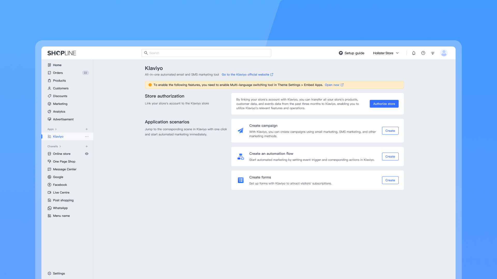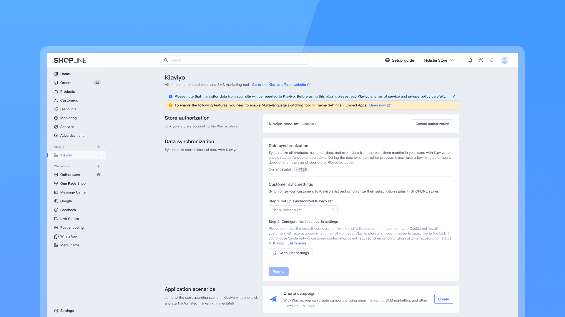 无需代码操作,一键即可把SHOPLINE店铺的客户、商品、订单事件数据同步到您的Klaviyo账号